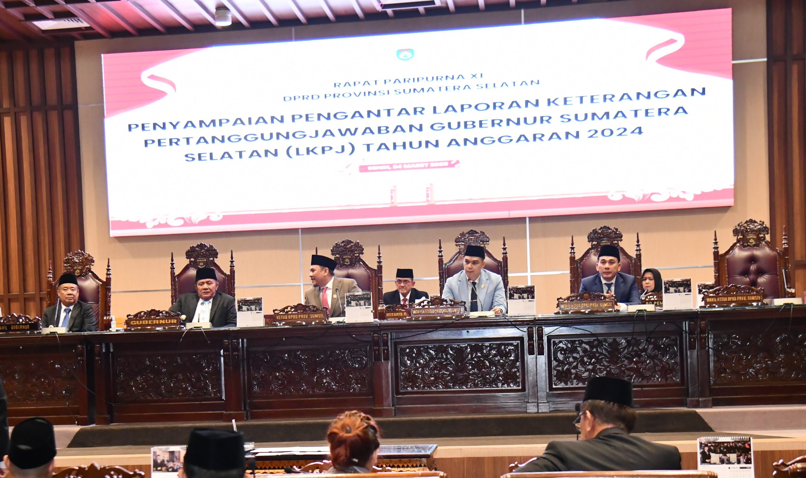 Pimpinan dan Anggota DPRD Provinsi Sumatera Selatan mendengarkan penyampaian pengantar Laporan Keterangan Pertanggungjawaban Gubernur Sumatera Selatan (LKPJ) Tahun Aggaran 2024 oleh Gubernur Provinsi Sumatera Selatan dan bentuk Panitia Khusus (Pansus) dalam membahasnya pada Rapat Paripurna XI (11) Dewan Perwakilan Rakyat Daerah Provinsi Sumatera Selatan bertempat di Ruang Rapat Paripurna DPRD Prov. Sumsel Senin 24/3/2025.