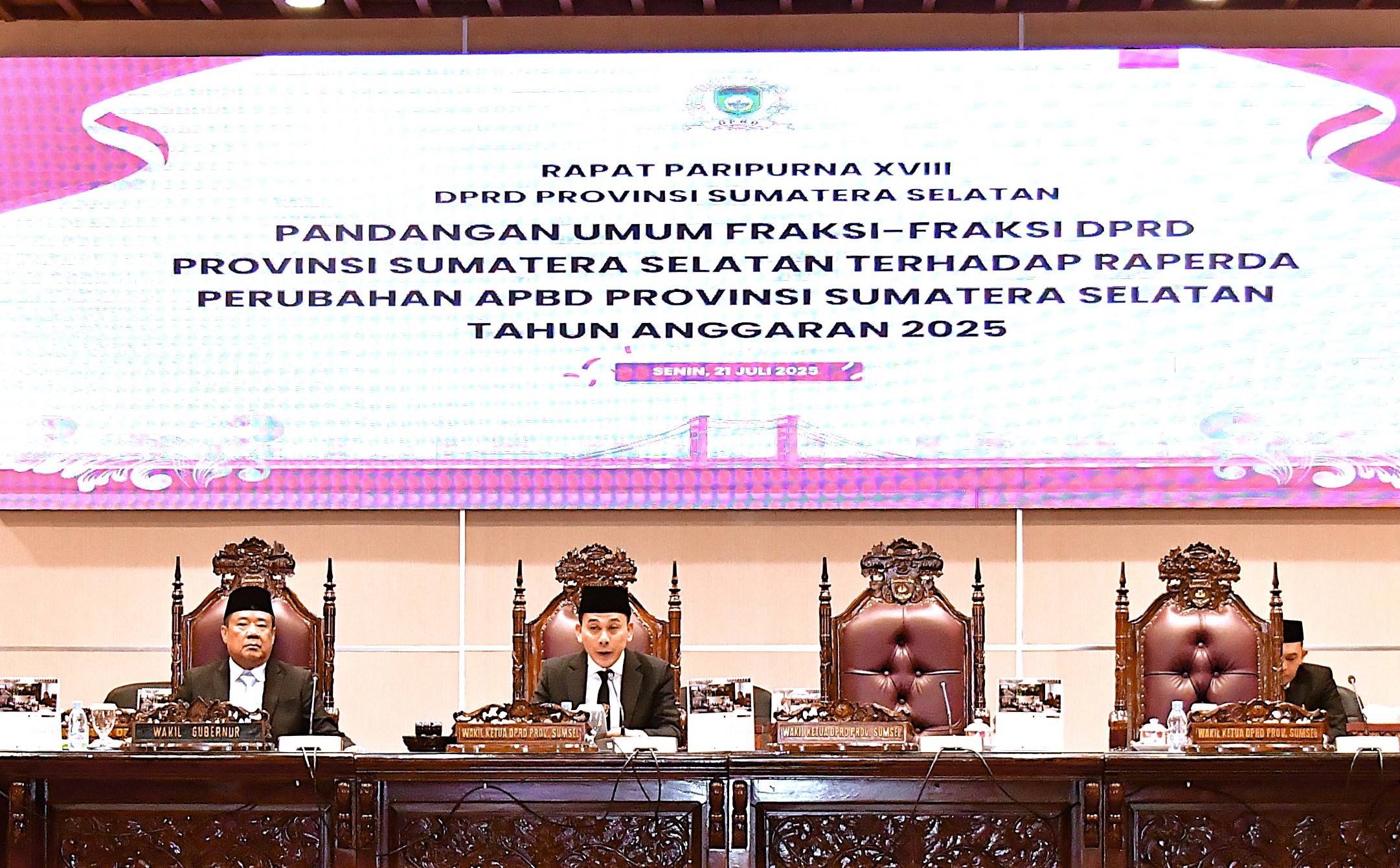 Sebanyak 8 Fraksi DPRD Provinsi Sumatera Selatan menyampaikan Pandangan umumnya terhadap terhadap rancangan Peraturan Daerah (Raperda) Provinsi Sumatera Selatan tentang perubahan APBD Provinsi Sumatera Selatan Tahun Anggaran (TA) 2025 pada Rapat Paripurna XVlll (18) lanjutan Dewan Perwakilan Rakyat Daerah Provinsi Sumatera Selatan bertempat di Ruang Rapat Paripurna DPRD Prov. Sumsel hari ini Senin, 21/7/25, yang raperda dimaksud telah dijelaskan terlebih dahulu oleh Gubernur Pada Rapat Paripurna sebelumnya Jumat,18/7/25.