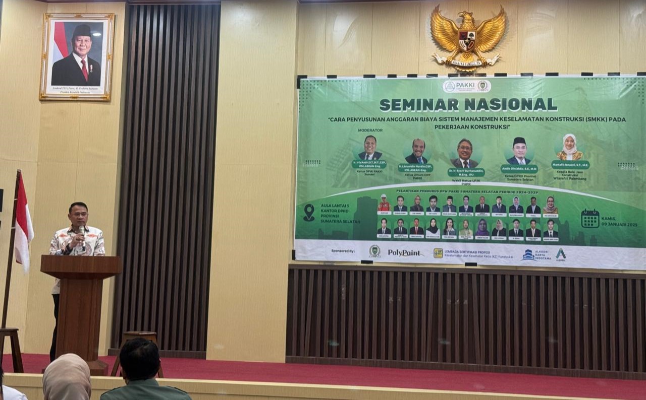 Ketua DPRD Provinsi Sumatera Selatan, Andie Dinialdie, SE, MM, memberikan sambutan dalam acara Seminar Nasional bertajuk “Cara Penyusunan Anggaran Biaya Sistem Manajemen Keselamatan Konstruksi (SMKK) Pada Pekerjaan Konstruksi”. Seminar ini sekaligus menjadi bagian dari agenda pelantikan Dewan Pengurus Wilayah Persatuan Ahli Keselamatan Konstruksi Indonesia (PAKKI) Provinsi Sumatera Selatan periode 2024-2029.